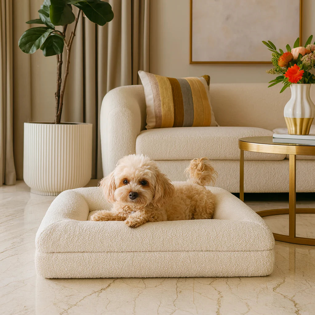 Pamper your dog with a bed that combines modern design with everyday comfort. Upholstered in premium bouclé fabric, it enhances your home while giving your dog a soft, inviting space to relax.
